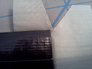 To make the sheet, rip off some long strips of duct tape (over 8 inches long) and lay them on your cutting board. They should partially overlap each other. Use as many strips as it takes to make it 7 or more inches tall--I managed it in four. A ruled cutting board is really handy here. Make sure to smooth out any air bubbles after laying each strip.